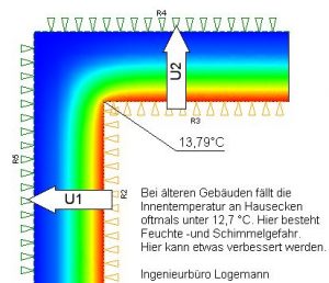 Dieses hat im Allgemeinen zur Folge, dass die Oberflächentemperatur des wärmeren Bauteils absinkt. Die Folge ist höhere Wärmeverluste und Absinken der Oberflächentemperatur auf ein Niveau bei dem ein erhöhtes Maß an Schimmelrisiko auftritt.